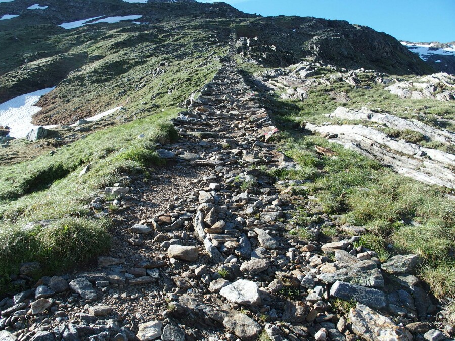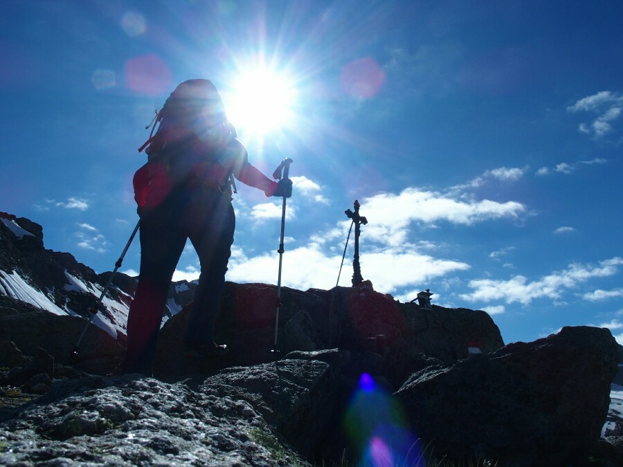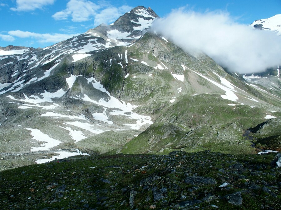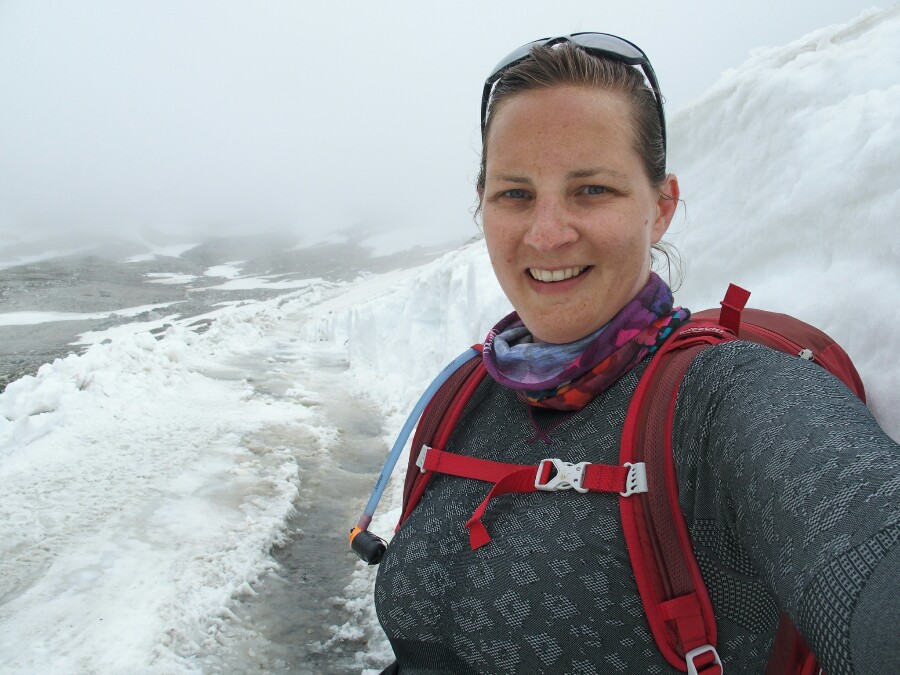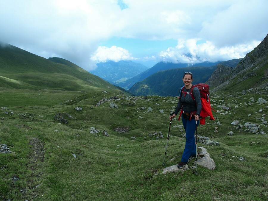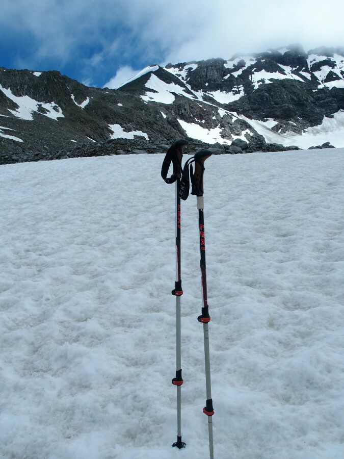 Day 9. The sun is shining this morning but we can also see some clouds coming. I am tempted to hike with the girls to the Sonnenblick summit, but I don’t think I can fit it in my schedule plus it would be exhausting. And I already am exhausted, the trail is not easy on my body. The start at 7am is already rather steep. Then snow fields. But not nice and easy ones, no this time icy snow. I walk extremely carefully and am glad that I have at least my hiking sticks. Some parts feel very dangerous but what can I do other then continue?