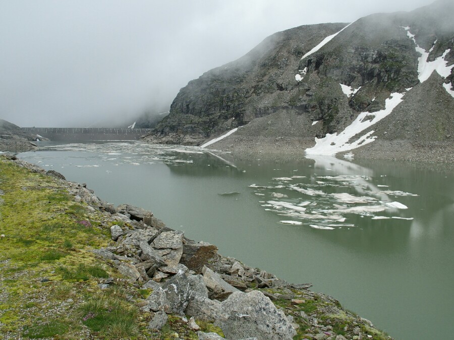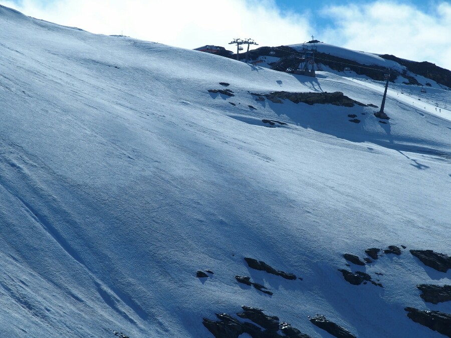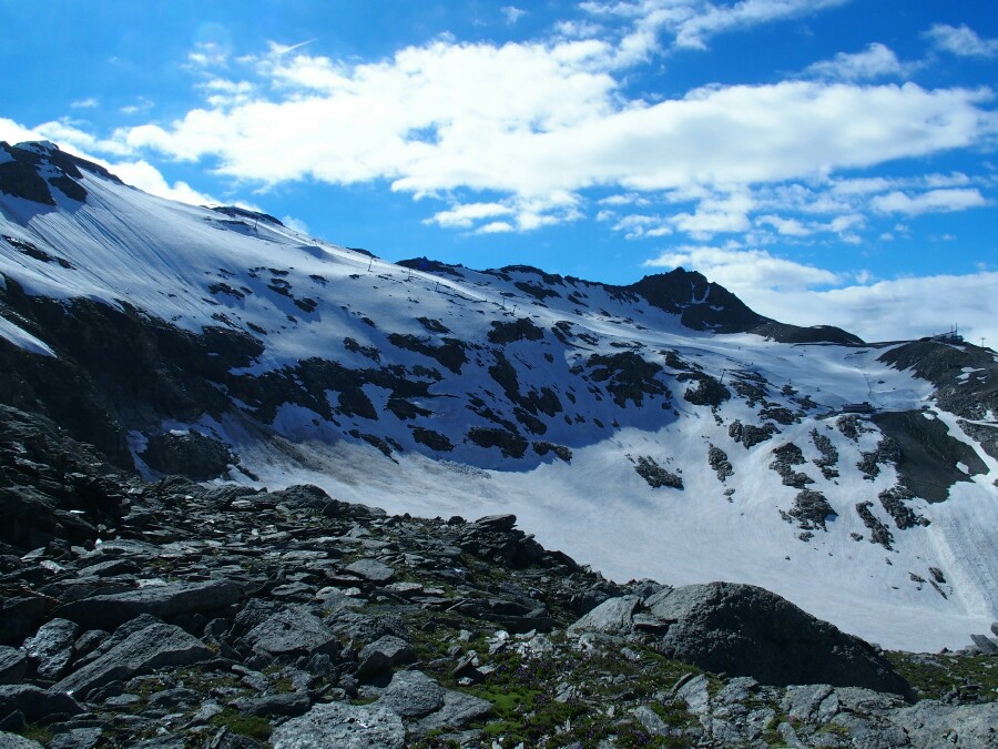 After almost 3 hours I am finally at the Fragranter Scharte. I decide to do the detour to the Ernst-Herzog-Spitze and see if a climb up the 3000 Schareck is feasible. But about 100m altitude below the Ernst-Herzog-Spitze I cannot continue. It is just too steep and snow covered. With spikes and an pickaxe it could be possible, but not for me and not today. A bit surreal is the view on the glacier with people skiing and the lift going up the Schareck. The view shows how the nature was destroyed due to the skiing tourism. I feel like in a different world as I hike along the artificial lake and the snowfields. It was pretty exhausting already today and a bit scary.