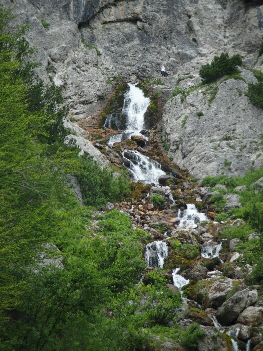Finally, finally I reach the Nadiża waterfall and see a lot of tourists who have come by car to the close by hut Dom v Tamarju and just walked up to the waterfall. It is surreal to see all these people after my fight all alone in the mountains finding the right path and not slipping and falling too much (my arms and legs have suffered though from cuts etc in addition to all the Moskito bites I already have). I try to clean myself a bit with the water from the waterfall and have a short lunch. Instead of 2 hours it took me 3 1/2 hours down from the saddle!