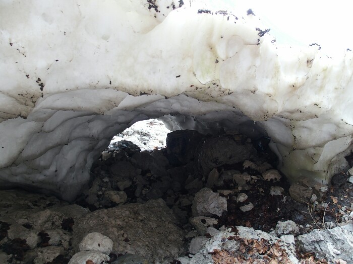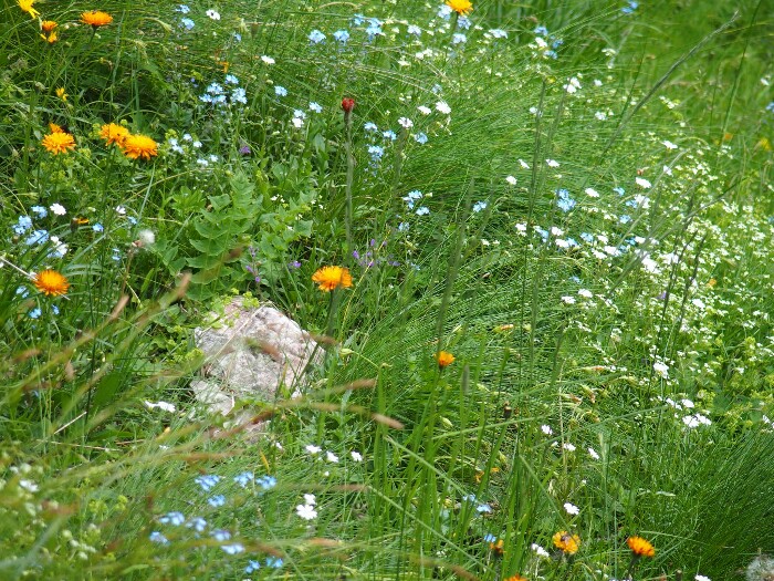 As I know there is still quite some trail to cover today I continue, reliefed that at least from here the trail will be well marked. So of I go through an empty riverbed into a gorge where there’s still some snow! Some more climbing but soon it’s just a hike uphill, through beautiful terrain. Flowers, boulders, stones, trees, and the rough mountains. There is a chilly wind from time to time. I can feel the weather change and I have a very bad feeling in my stomach. Is it because of the weather change or because of all the adrenaline gone when I was scared up in the difficult mountain part? I cannot sit down and relax, I have to continue.