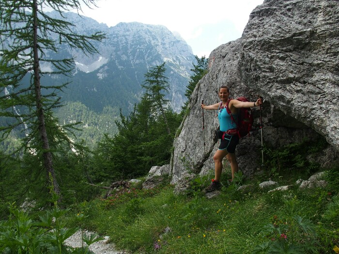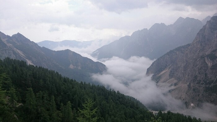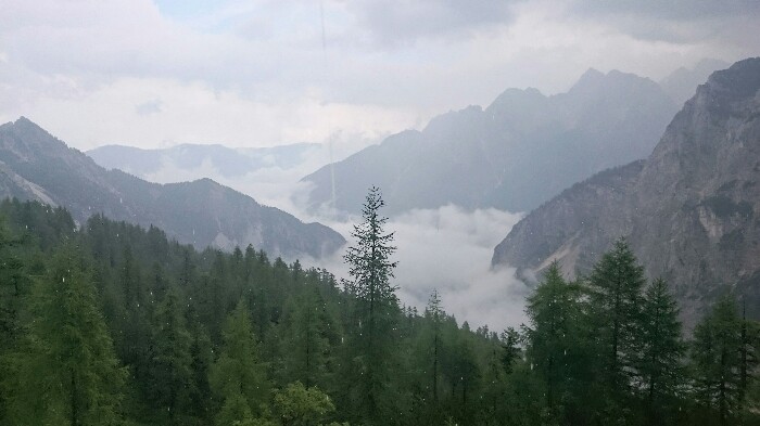 Day 18. REST DAY. The really big thunderstorm came last night. Half an hour of lighting and growling thunder. This morning it’s raining cats and dogs. And cows and sheeps and horses and…  A quick look at the weather forecast and it is confirmed, I will take a rest day. More thunderstorms to come during the day. Luckily I found out that there is a bus going to the next small town. I enjoy a relaxed breakfast, take my time to finally do all my back exercises and some yoga, organise my stuff and take the bus to Trenta at 10am. Half an hour later I am at the Triglav information center. There is also a pizzeria and it seems a very small shop. First stop in the tourist center. There is a small museum about the triglav national park (5€ entry, maybe later) but for now I only buy some postcards and get some advice on visiting a close by gorge of the Soče river. Before going there I want to take a coffee so I sit on the nice covered terrace of the pizzeria. And then the next thunderstorm. Luckily they have Wi-Fi so I decide to write my blog instead. I have more than four more hours to go until the bus leaves for my hut.