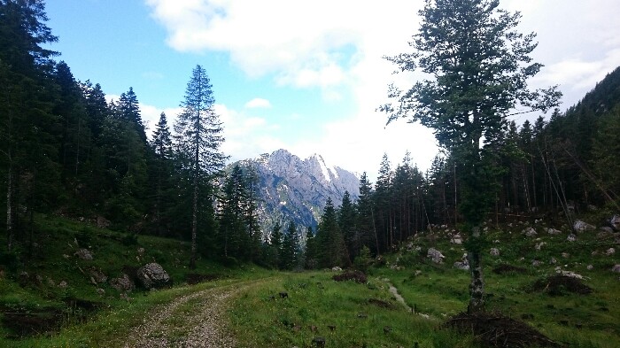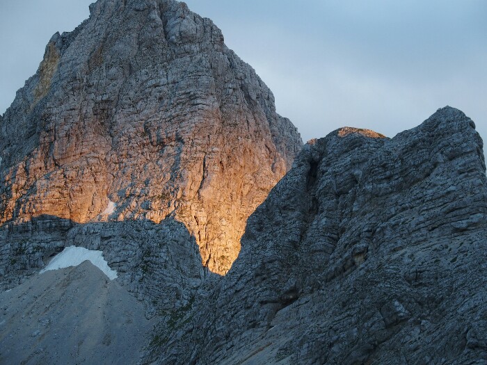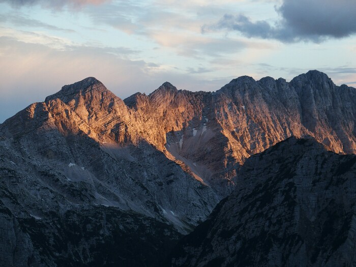 There are already two Irish guys at the hut and it’s so nice to have someone to talk to. The hut has an amazing view on the valley and the mountains. A Scottish couple joins a bit later, all are doing the nice via ferrata here. We spend a very nice evening chatting and eating and I am even invited to some wine. Just the Slovenian food is an issue. As I don’t eat goulash, I have to take Jota, which is a soup consisting of sour cabbage and if you look hard also some potatoes. Ugh. Afterwards I really need an apple strudel to get rid of the sour taste. Plus the mountain glow in the evening is just beautiful. I am again the only one in the dormitory as the others are in a room. It is really cold and hard to sleep for me tonight.