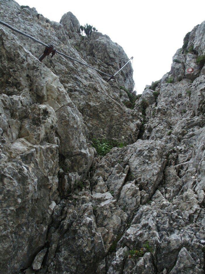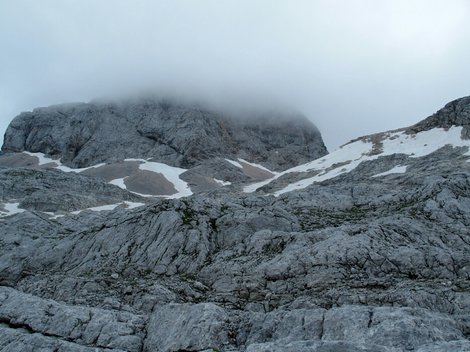 At the Luknja pass I have to take the decision if I should hike up to the Triglav via the difficult Bamberg Weg. The first part looks rather difficult. A Slovenian couple decides to not do it but tell me that the beginning and end is difficult but then it’s fine. So off I go, enjoying a lot the climbing. The trail alternates between via ferrata, other unsecured climbing parts and some easier hiking. It’s steep and challenging but I always have the feeling that I can well handle it. Closer to the top of the first steep part I start to feel tired but worse is the wind, or storm, that kicks in. It’s very cold and I cannot sit down anywhere to take a rest, it’s just to cold. It’s becoming flatter and easier to hike, there are again snowfields to cross. Sometimes the wind is so strong I have to go down on my knees. My face hurts because of the cold. I reach the sign “Triglav 1h”. From there it is again climbing and via ferrata. But I am done. My legs are tired, I am freezing and it would be too risky to climb up to probably even stronger winds. It’s a hard decision but the Triglav is covered in clouds so I wouldn’t even see anything.