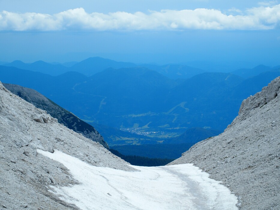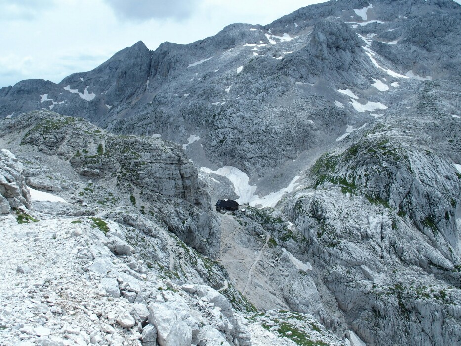 At the Luknja pass I have to take the decision if I should hike up to the Triglav via the difficult Bamberg Weg. The first part looks rather difficult. A Slovenian couple decides to not do it but tell me that the beginning and end is difficult but then it’s fine. So off I go, enjoying a lot the climbing. The trail alternates between via ferrata, other unsecured climbing parts and some easier hiking. It’s steep and challenging but I always have the feeling that I can well handle it. Closer to the top of the first steep part I start to feel tired but worse is the wind, or storm, that kicks in. It’s very cold and I cannot sit down anywhere to take a rest, it’s just to cold. It’s becoming flatter and easier to hike, there are again snowfields to cross. Sometimes the wind is so strong I have to go down on my knees. My face hurts because of the cold. I reach the sign “Triglav 1h”. From there it is again climbing and via ferrata. But I am done. My legs are tired, I am freezing and it would be too risky to climb up to probably even stronger winds. It’s a hard decision but the Triglav is covered in clouds so I wouldn’t even see anything.