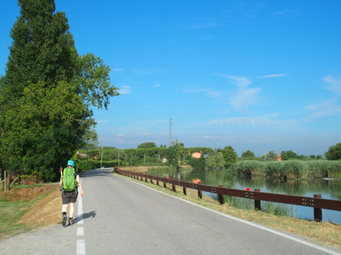 I sleep a little but we still have 2h30 left to hike in the blazing sun. It’s close to 40 degree Celsius in the sun and no fun anymore. We just want to arrive at the hotel. Then the bottom of one of Claudia’s hiking boots starts falling apart! Some tape to fix it temporarily but soon Claudia has to change into her hiking sandals. Italy has already cost us another boots victim without even arriving at the mountains! You could get new bottoms for her sturdy boots, but how to find someone out here? We’ll have some time to figure out, two more days in this hot area before we are finally in the mountains. I can’t wait, we catched today the first glimpse of the mountains. This hike today was just something I wanted to get over, only a few nice moments and views but mainly the strenuous hike under the very hot sun. But it’s part of my chosen trail and not everything can be nice and beautiful.