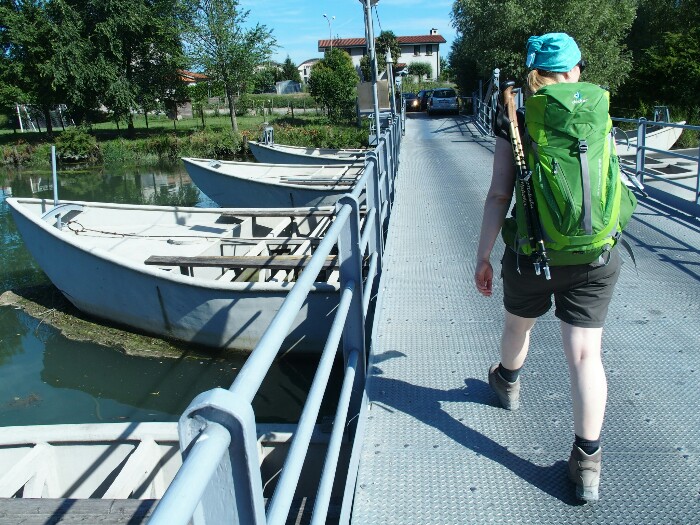 Day 2. It’s been a difficult night, too hot to sleep with windows closed but too noisy with them open. Good breakfast and we start at 7h30 am, we have a long fay ahead. The first few hours are fine, mainly along the river and close to a beautiful lagoon we can unfortunately see only a few times. Sometimes on the road, sometimes nice hiking ground. It’s getting warmer and warmer. Still we do a recommended detour to avoid the road and after 4h we are in a town where we buy some lunch.