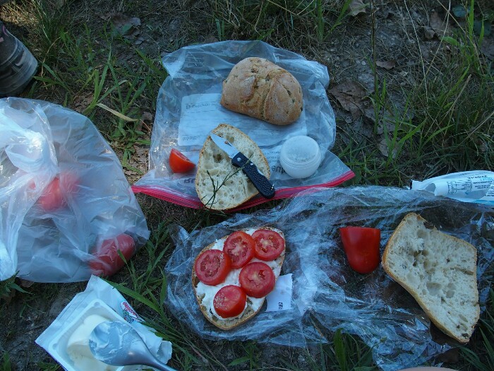 From there we will walk mainly on or close by a dam that should protect from floods. Hard to imagine how a flood could happen in this arid and hot area! We are feeling so hot and are looking for a nice place for our lunch. In the end it’s more or less the only tree we choose for its shadow. Yummy, bread, cheese and tomatoes always taste best outside after some effort!