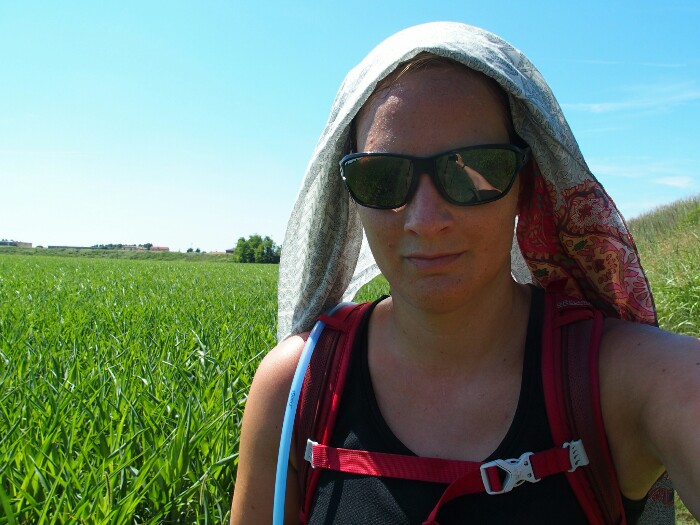 Exhausted we arrive at the end of the trail for today and I buy a liter of water I am drinking right away plus some ice-cream. Then it is another 2km on a very busy road to reach the hotel, as the recommended one on the trail was fully booked. We have both suffered from the sun but for Claudia it has been worse, only her second day, blisters, her white skin not even protected by a SPF 50. So I walk another kilometer to buy dinner and breakfast for us before crashing on the bed. At least we have air conditioning tonight!