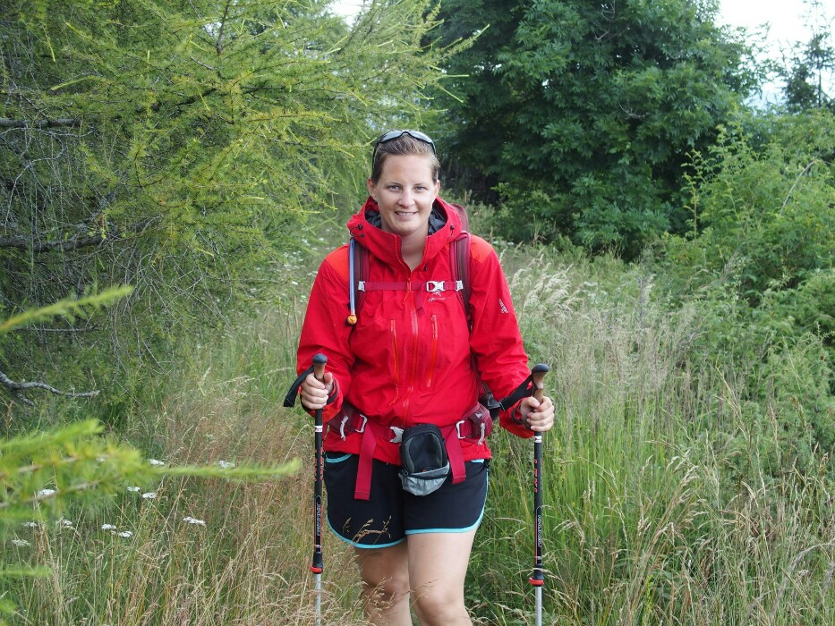 For my sister it’s difficult with her feet and now her other boot needs to be taped. Until it completely breaks down and the whole bottom is off. So now plan B, I am going to hike in Claudia’s hiking sandals (as I am much more used to hiking) and Claudia gets my boots. Slowly we continue until a hut where we buy something to drink and are allowed to eat our own food. We meet four other hikers (who of course are hiking the other way) so we talk about the trail and what’s coming. Then it’s getting really beautiful as we hike along the ridge, through plants and blooming nature, with views to the coming mountains and the flat land we left behind. Clouds and fog start to obscure our view but it doesn’t matter. I am so happy to be back here in the mountains!