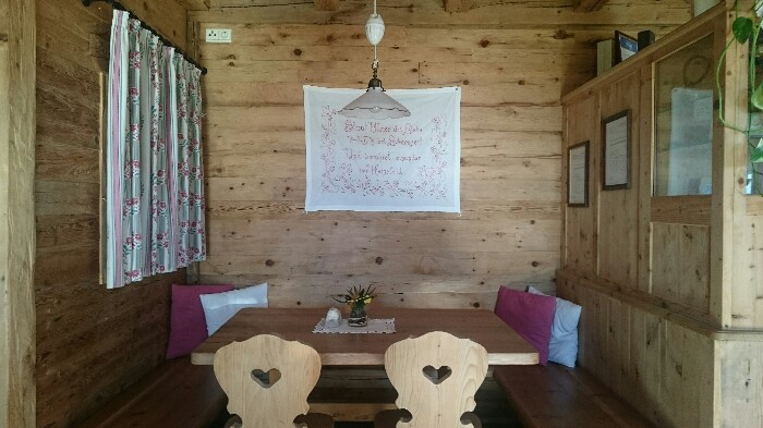 Day 15. Würzjoch – Kreuzwiesenalm. After yesterday’s crazy long day I try sleep in (a little but as always I woke up often) and enjoy the four star breakfast for a while. I am so happy now when I get a good breakfast and this will probably not get any better. Having a small dormitory in a star hotel enables us to benefit without spending too much money. Fresh fruit salad as much as I can eat is my favourite next to the very good wholemeal bread. Luckily we have now a very short day ahead as there is a need for digestion first 😉 It’s supposed to be 6h but it turns out much shorter and we take a lot of breaks. Although we are still at around 2,000m altitude, it doesn’t feel like it. It’s very green with plenty of farmland and cows. The many alpine pastures offer drinks and food to the hikers and bikers.