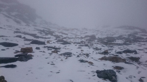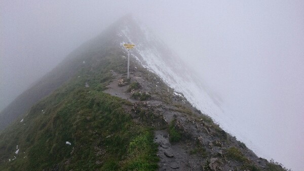 Then a half hour fast hike to the Tuxer Joch hut. From there we need to hurry up as it’s already 12h and the trail supposedly 5-6h at least. We hike in the rain up and endless, grass covered mountain in serpentines. I am wet and cold and feel far too tired for hiking. Finally it gets a little less steep but the we arrive at the first notch, on the other side everything is covered in snow. We continue to hike down and up and down and up in the snow and cold. The fog prevents us from seeing anything and my mood couldn’t be worse! We are now getting into the military zone where we aren’t allowed to leave the trail. There is a huge area where there are still trainings and days where access is closed for training shootings. Unbelievable what happens in these beautiful mountains (OK at that moment I cannot even see them but hate them).