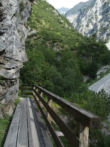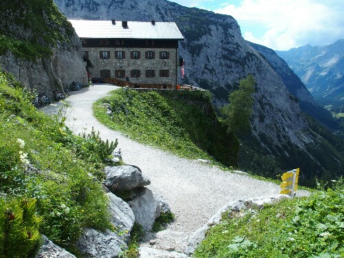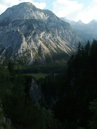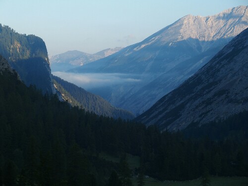 Although it’s will be a short day we have early breakfast at 7am as a thunderstorm is announced for the afternoon. Today we will hike from the valley at about 500m to the hut at 1700m via a 2000m high notch. First an hour road walk, then into the Karwendel.