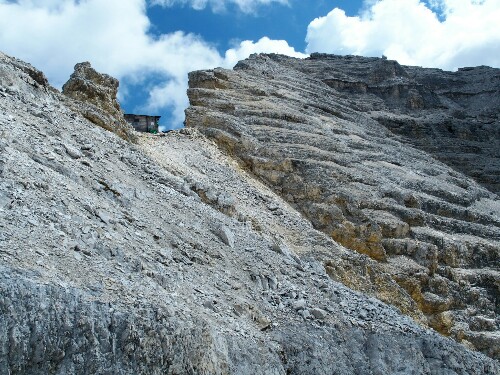 But then we still have to hike down and as dark clouds are coming in we are starting the descent. Especially the beginning is tough and steep again but it gets easier as we go. We finally reach the green Latschen trees and hike further until we see the hut. We see it but we are just above it and to challenge our legs one more time we need to climb down on a ferrata stretch before we can finally reach the hut.