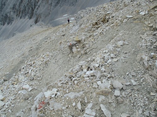 Then a turn into the next valley to go upwards for 1550m altitude. From easy it will become more challenging and finally exhausting as we climb up very steep Schotter and Geröll parts. For two steps up you glide one down.