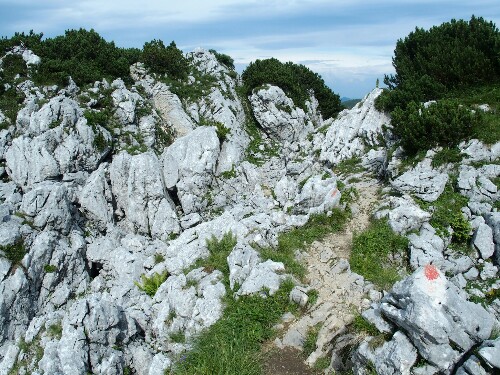 We hike down to the hut – which is just below the summit but a few hundred metres of altitude in between – taking the more difficult trail with some ferrata sections. Not easy as it’s wet. The hut is nice, clean and warm with nice tenants. Dinner is delicious and we have nice company with a girl originally from the region but now living in the Netherlands (hiking the Maximilian trail), a guy who started today a few days hiking and a French guy doing the Via Alpina (the violett one). As we go sleeping it seems only a few people are with us in the dormitory. Four girls join an hour later, a guy follows and at 11.30pm suddenly five more people come in with their backpacks! I cannot sleep much that night, it’s so bright outside it must be (close to) full moon.