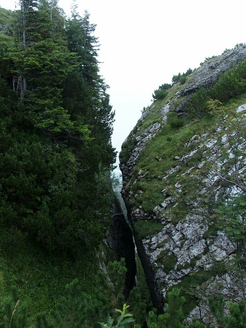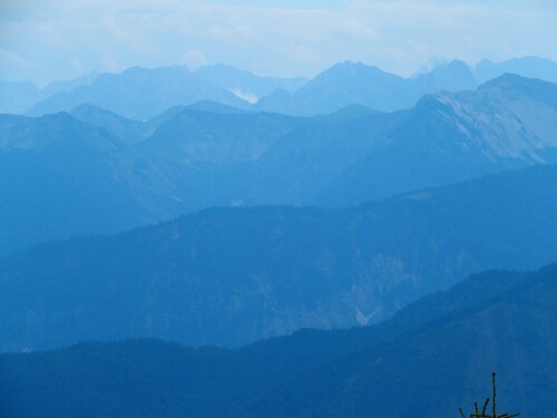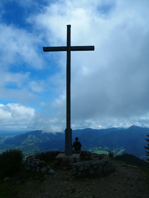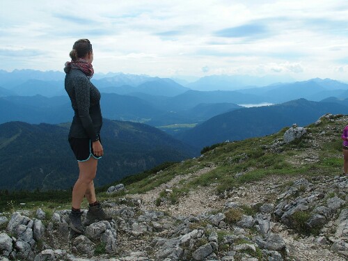 Afterwards it’s time to hike up our last mountain range. First easily along a small river. Then up besides a waterfall and then through more mud in the forest. It’s dreading to rain the whole day and I even think a thunderstorm will come. We are lucky though and at the intersection we opt for the long trail, first to the top of the Benediktenwand and then down to our hut. It is a beautiful hike and I feel strong, finally climbing up is easy – at least at this lower altitude! The view is great, on one side back to the mountains we came from (plus supposedly the Zugspitze but I cannot identify clearly which one it is), on the other the flat land, the big Starnberger See and somewhere in the mist must be Munich.