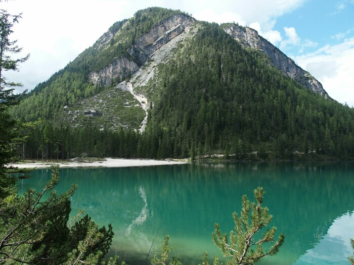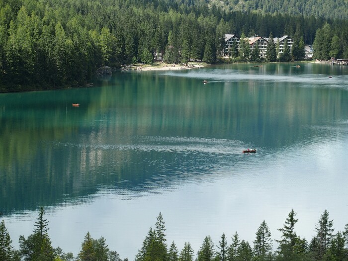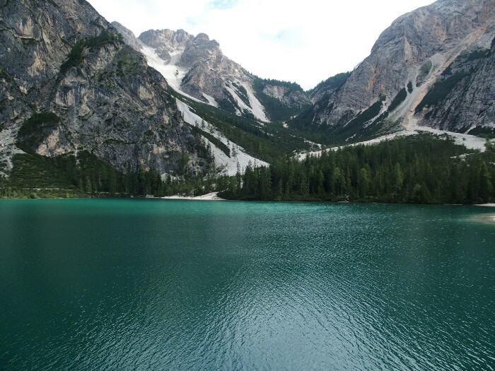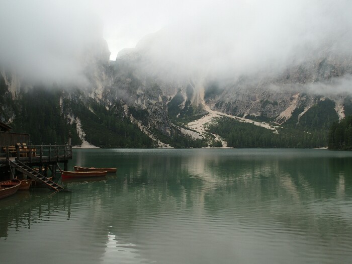 For a few days I am staying at a hotel close to the Drei Zinnen / Tre Cime national park in South Tyrol and enjoy a few day hikes from here. The nice family owned hotel Rainegg is in Olang and offers not only home made food as half board but also great advice for hiking tours and nice chats. Although two highlights are already clear for me: the Drei Zinnen and the Pragser Wildsee of course. After the thunderstorm while driving here, the next day looks rather promising and as early as breakfast permits I am driving to the Pragser Wildsee. For 5€ (well, usually 6€ but the friendly guy gives me a discount) you can park your car close to the lake. At 8.30am there aren’t many people around yet. Despite the clouds, the light at the lake is magical as I hike to the other end.