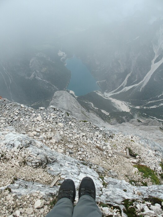 My destination for today is obviously not just the lake but the mountain Seekofel. The clouds don’t show it much yet but the summit is around 1300m altitude above the lake. Not many people are hiking yet, but a few are overtaking me on the three hours climb to the summit. Not that I didn’t get any training during the last weeks but it seems my lungs are just not made for hiking easily uphill. I have a short conversation with an Italian about the destination until we agree on our same destinations (again, in South Tyrol everything has a German and an Italian name which are often very different).