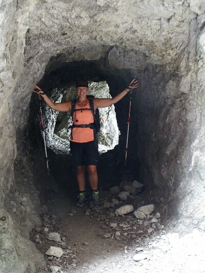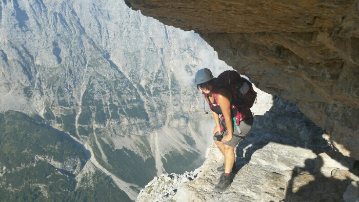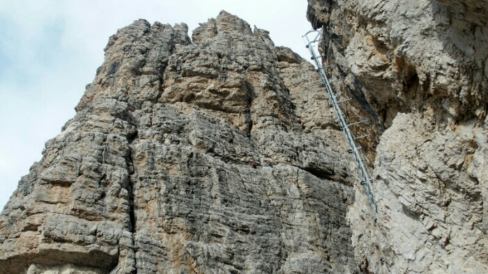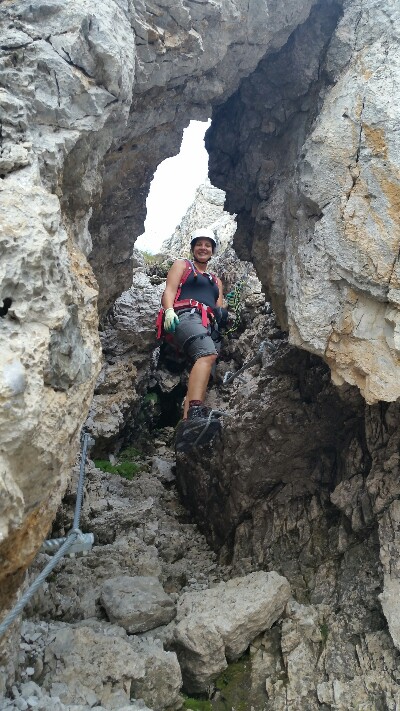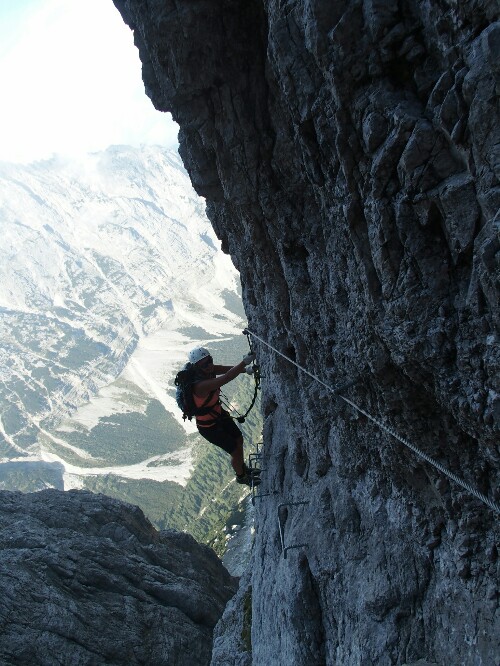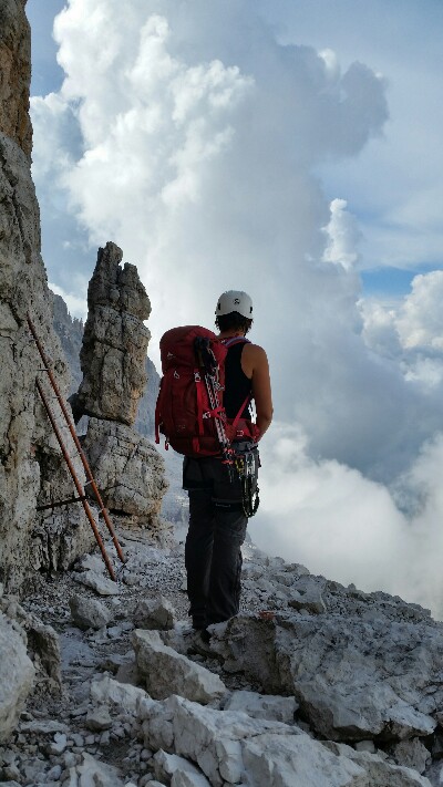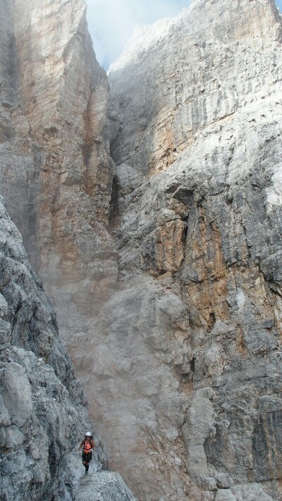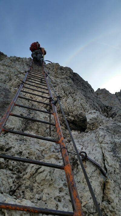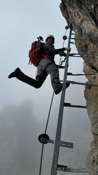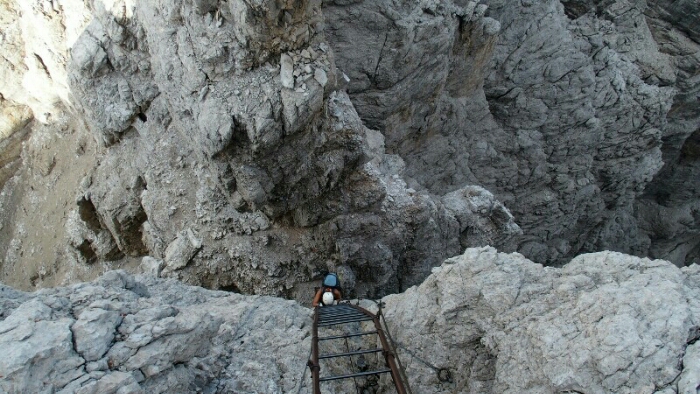 We choose the (hopefully) easier via ferrata Spellini which is relatively new (since 2010). Already the first ladder is difficult as it’s inclined to the back and it takes all our core strength to keep ourselves on the ladder with the backpacks. It’s a short ferrata though and despite the difficulties I love the feeling of being right inside the mountains.