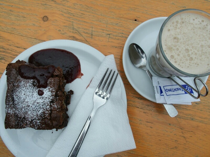After 90minutes we are at the Brentei hut where we treat ourselves to a big chocolate cake with another coffee.