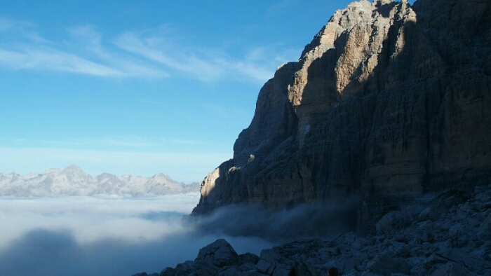 I had planned the itinerary months ago with a lack of understanding of timings and difficulties for via ferrate. I have done just a few so far but I have learned climbing a bit. For Peggy it’s the first time! I already saw that the timing is a bit tight for today. The first part is the Sentiero Benini, starting directly at the Passo del Grostè. How great to be immediately right above the clouds in the heart of the Brenta and climbing into the impressive mountain towers.