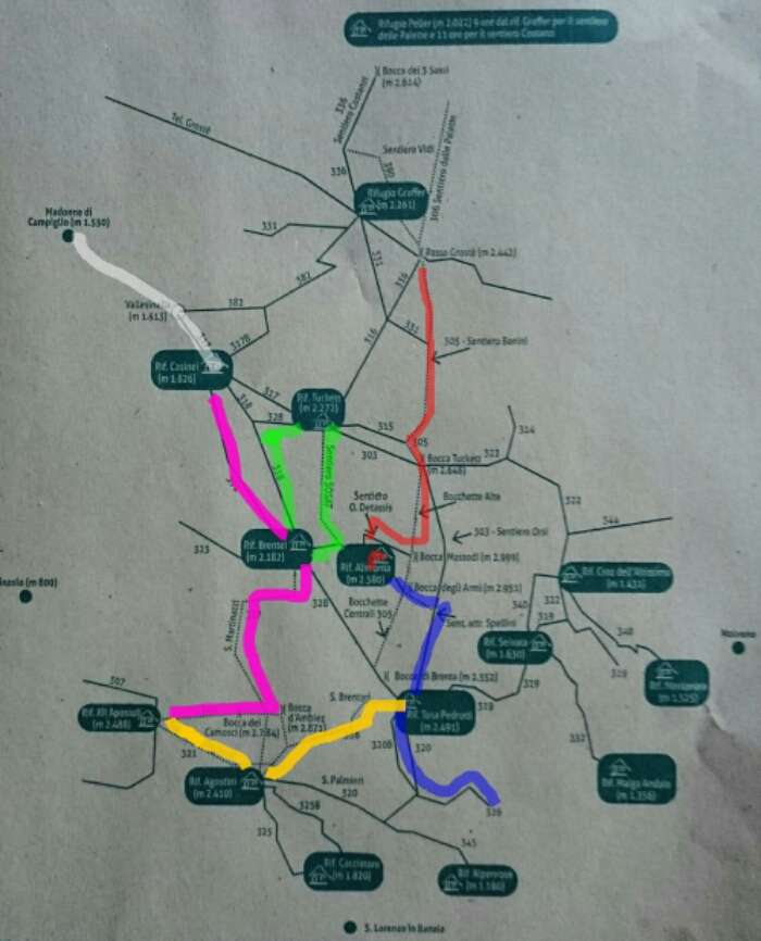 Day 5: Pink: Martinazzi to Brentei hut. Hiking trail to Casinei hut.