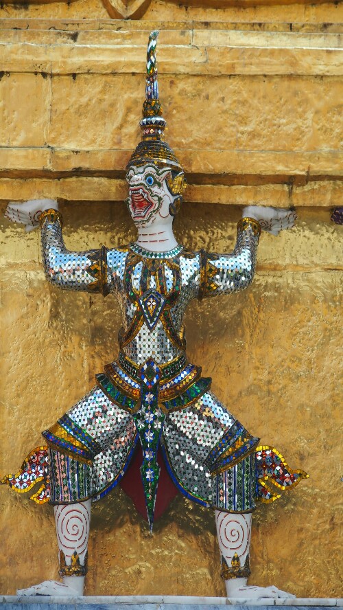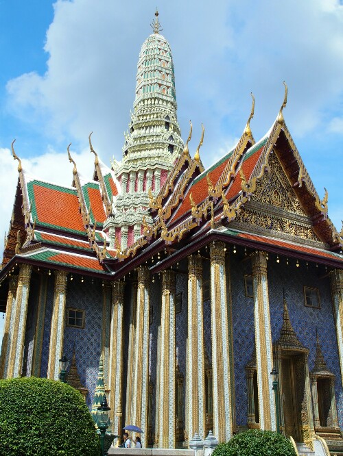 Then I buy some delicious food before taking the bus back into town, heading for the Grand Palace and Wat Phra Kaeow (the temple of the emerald Buddha which by the way is so small you cannot really see it – but all the other buildings around are worth a visit). The entrance fee is expensive with 500 Bhat and you need to be well covered as otherwise they won’t let you in – though you can borrow clothes at the entrance for a deposit and queue). So much gold and so well kept! Although it’s busy with plenty of tourists, I enjoy the visit and take my time to walk around.