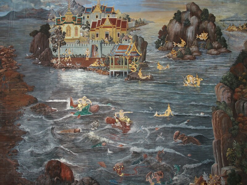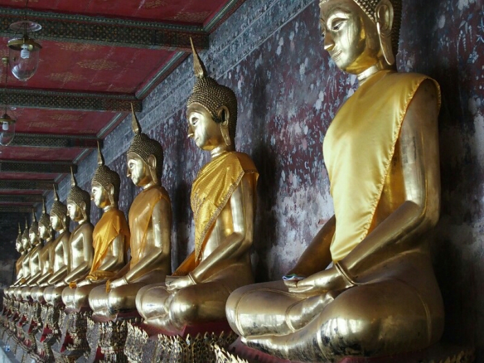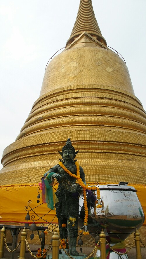 After two hours I am tired, also it gets crowded now. So I am heading back to my hostel for some more sleep in (almost) silence now. Then I am off to visit a few temples. First I walk to the Giant Swing. It was formerly used as swing in religious ceremonies, but discontinued in 1935 after several fatal accidents.The swing itself is not really worth a visit but the neighbouring temple Wat Suthat has become my favourite one! The Buddha statue and the wall paintings are beautiful, but I also got to discover for the first time in Bangkok some silence and could feel that I am in a very special place.