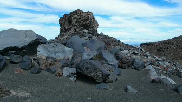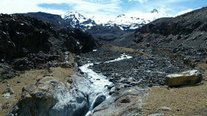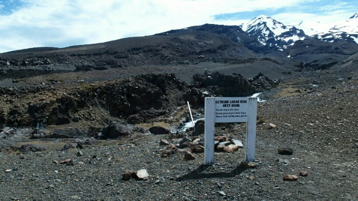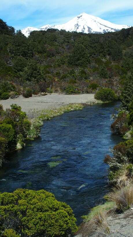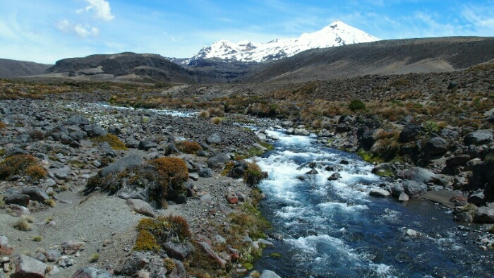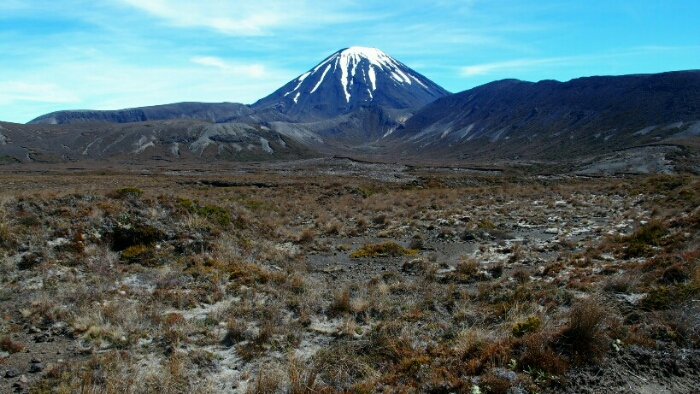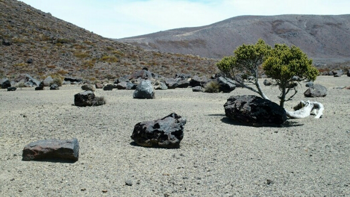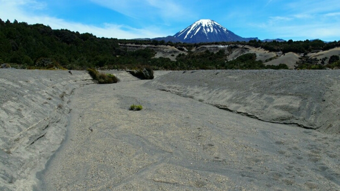 So I continue into the volcanic desert, a unique setting! The sand (or ash?), stones and rare plants of this arid landscape is in strong contrast to the snow white Ruapehu mountain. There are numerous (empty) riverbeds to hike through in a constant up and down, under the burning hot sun. I still love it as it is so different from everything I have seen so far!