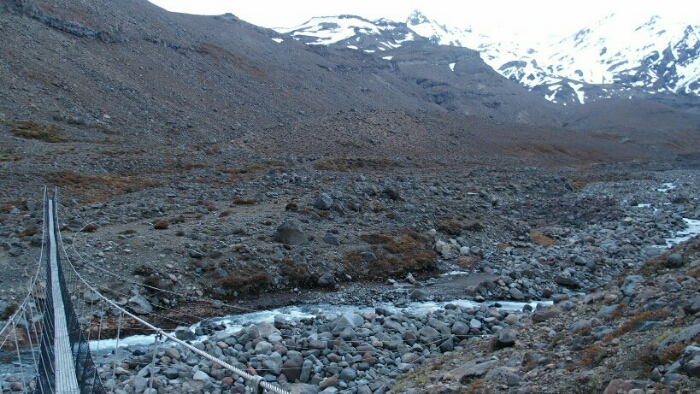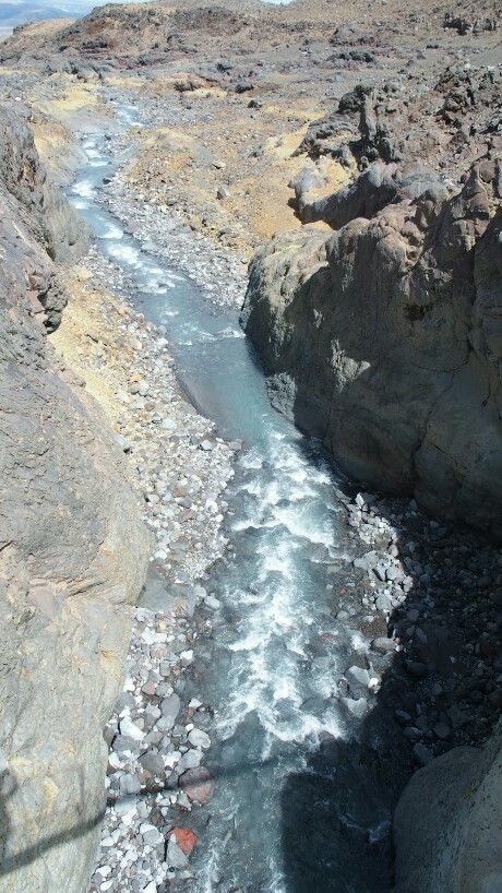 The highlight is the impressive gorge crossing on a swingbridge. A sign warns that this is an extremely dangerous lahar zone (volcanic mud flow) and that the next 400m should be crossed quickly. The water below me is squeezed through a small space between two rocks, making a strong sound, but only if I am standing right above it, the rocks protecting from the noise once you are off the swingbridge. Hiking across the bridge itself is pretty scary for me, even after all the swingbridges I had to cross in Nepal I still don’t like them.