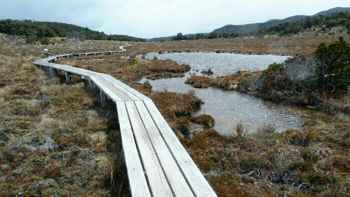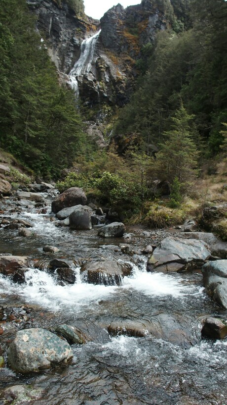 Suddenly I see a toilet and wonder why is there one, but then I see the hut. It’s just past 9am! I didn’t expect to be here that fast! Also I expected a difficult river crossing that wasn’t yet happening. I take a short break before continuing, happy I may be rather early in my hut today and have time to relax. I hike on through the very windy day on easy trails, often there are boardwalks installed. After a last river crossing I can see a beautiful waterfall before the last stretch to the road.