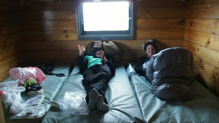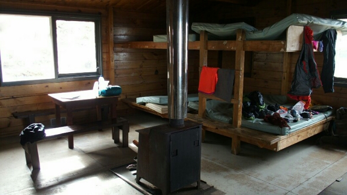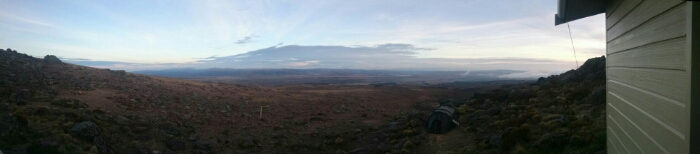 After all that awesomeness I crash my camera… I often put it on a rock to take a picture of myself, this time I didn’t place it well apparently as a sudden wind blows it down. The screen is smashed but it still works. At least it’s not completely broken! Soon after I reach the Rangipo hut which has a perfect view on mountains and the valley. Robin and Chloé are already there plus another couple who prefer to sleep outside in their tent. There is plenty of space in the hut, even when Liz and 3 others arrive we can all have our place to spread gear and relax well with the wonderful view. There isn’t any firewood but it’s perfectly warm anyway.