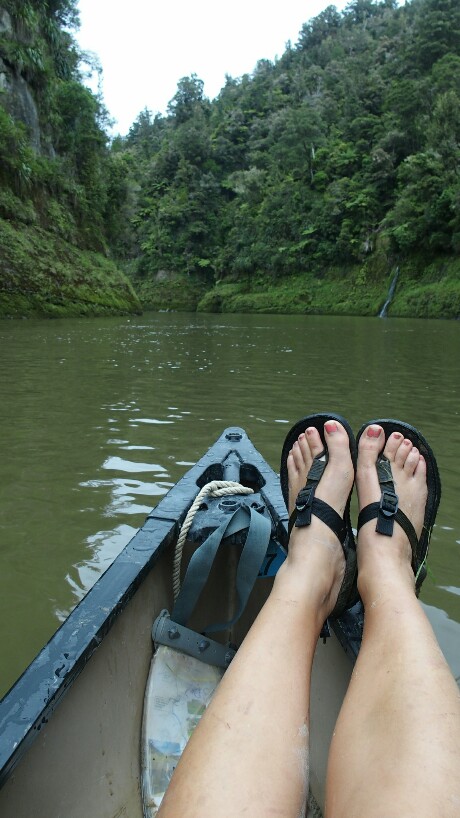 We have only a short day ahead so we take it slowly in the morning. I do my exercises as I had back pain the last few nights, then tea, breakfast, hot chocolate and packing up. Carrying all the barrels and gear down to the river, tying it all well up and getting started takes quite some time. I think we start around 9.30am finally together with Alex and Michaela. I am now in the backseat, the navigator and a little bit scared in the beginning. There isn’t so much you can do wrong but it’s not easy to navigate and keeping the boat straight in the direction I want without slowing it down. Brad is pretty patient though and the others are waiting from time to time. And the river is stunning, plenty of waterfalls, gorges, little caves…. I can already feel though that I prefer to hike. I feel a bit restraint in the boat, I can’t just stop and take pictures, get food or anything else out of my pack, go to the loo…. It’s still a good change and at least my feet and legs appreciate the break. My shoulders aren’t so happy though 😉 Plus, it’s cloudy but not raining!