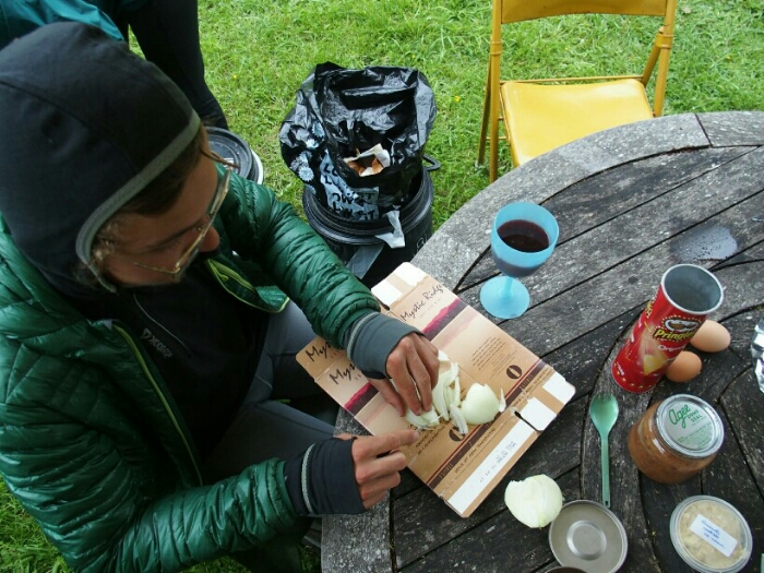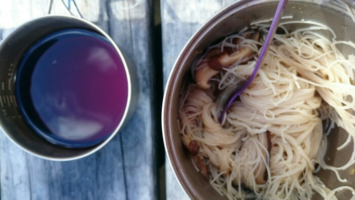As we reach the campsite we have to carry up all the barrels plus the boat which is pretty heavy. The campsite is rather full but there is a nice spot for us all to camp together next to a table that still gets a lot of sun. Alexander and Michaela, a couple from Seattle we already met yesterday is there as well. We are excited about all the food and start sharing our snacks and drink some vine and cider. We start cooking dinner early, my dried Shitake mushrooms are a success, with rice vermicelli and a honey-soy sauce. It’s the first time though I found them in a supermarket, hopefully there will be more. Everyone makes the others taste their dinner and Alex and Michaela even share their nice fresh paprika and onions. Then a big group brings us their leftovers of rice and curry, it seems everyone knows already we are the bunch of hungry hikers!