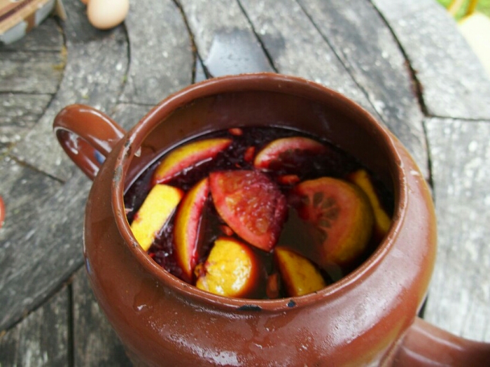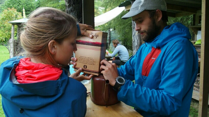 Before we know it we are then already through a final rapid (and another shower for Bettina) and at the Flying Fox campsite. It’s 5.30pm or so and we have just made our first 50km day! Plus, the Flying Fox is the most wonderful place. There is a big house, small cottages to rent, a glamping and a camping place, a little kitchen with nice seating area, a shower and bathtub and a fireplace with wood. I almost forgot the little shop! They have a nice selection of food, some handmade like that jam or rhubarb-crumble -ice-cream (which I totally buy of course). I am also getting an onion for my dinner and we order two big loafs of handmade bread for the next day. While I am taking a shower, Matt and Quinn cut down some fresh orange, pamplemousse and lemon and mix it with red wine for Sangria. It’s so delicious, I might get drunk tonight! I cook myself a perfect little dinner with onion, peas, noodles, tomatoe soup, cheese and wine. Everyone else loves it too so I am sharing. We are all eating and drinking and lighting a fire. It’s such a perfect evening! The rain then has us head back underneath a shelter and then to bed. It’s like 11pm and I am a bit drunk, hopefully I won’t get sea sick tomorrow 😉