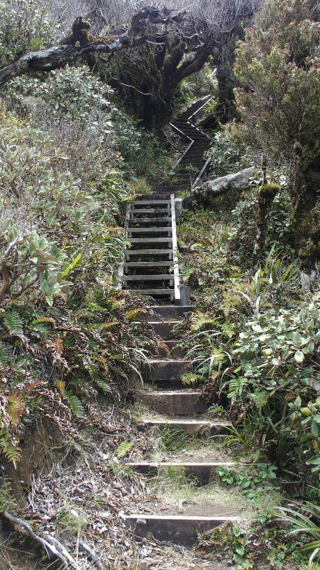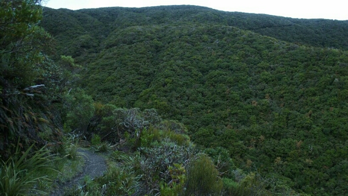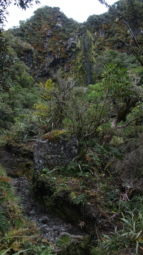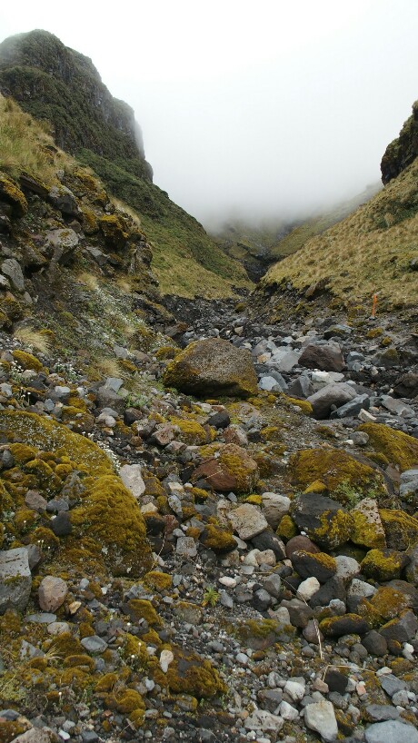 Then it’s a rather steep climb up the ridge line of the Pouakai mountain. After just 90minutes I am already at the hut. The clouds are now up to the hut and you can’t see anything. Then it’s starting to rain. I am happy to be inside chatting with two girls from the USA (and another coincidence, I met one of them yesterday in Whanganui plus I know one of her friends, Liz, who is doing the Te Araroa). A German couple is there as well, they kindly offer me their full gas canister in exchange of my almost empty one. Dinner is lentils, couscous, peas and a very good honey soy sauce followed by yummy TimTam cookies, the Christmas gift from my Canadians.