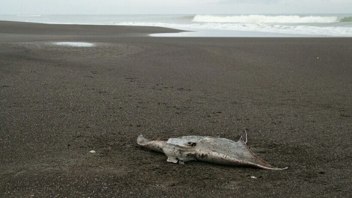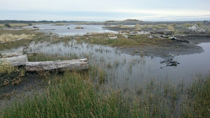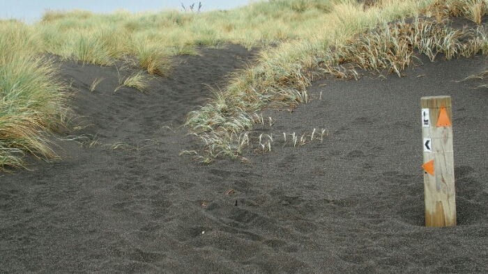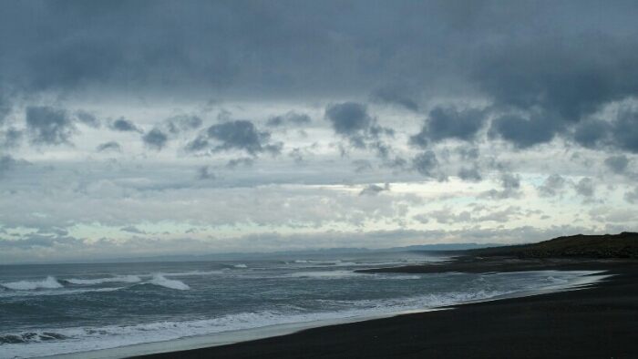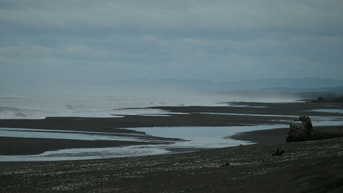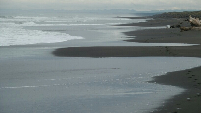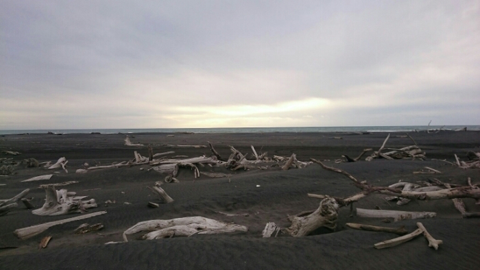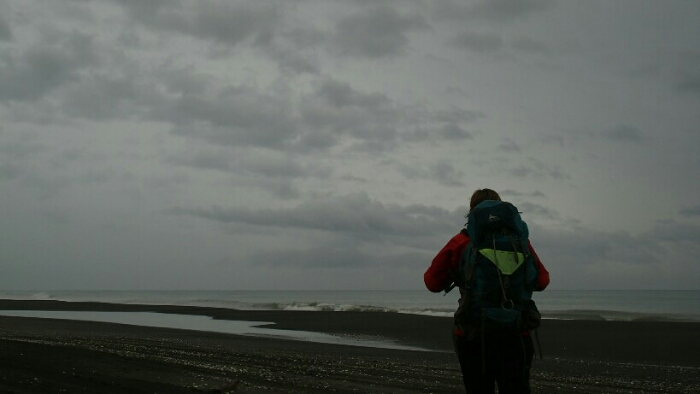 It’s been raining at night but when I wake up at 5am it’s just cloudy. I pack up all my stuff in the shower room as it’s dry there and everyone else is asleep anyway. Before 6am I head to the beach. So cool with the black sand! Too many clouds though, it doesn’t take long before its raining again. Luckily a rather short shower only. The beach is beautiful with all the logs and I love walking barefoot again for 7km in the sand.