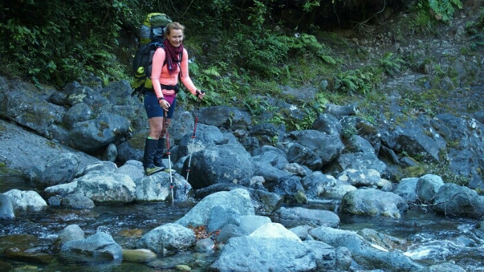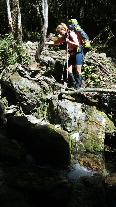 The night was pretty busy and noisy. At 8pm when we were already in our sleeping bags, 4 people arrived, at 9pm 2 more, sleeping on the floor. Luckily also a few others like to get up early so we are again up and running at 7am. The first hour is easy, along the river to the Hackett Junction and at 8.15am we are at Hackett Hut where some hikers still have their breakfast. Then it gets tough, a sign already warns us about multiple river crossings, dangerous in wet weather. Well, we have been very lucky so far with only sunshine the last few days so that’s no problem.