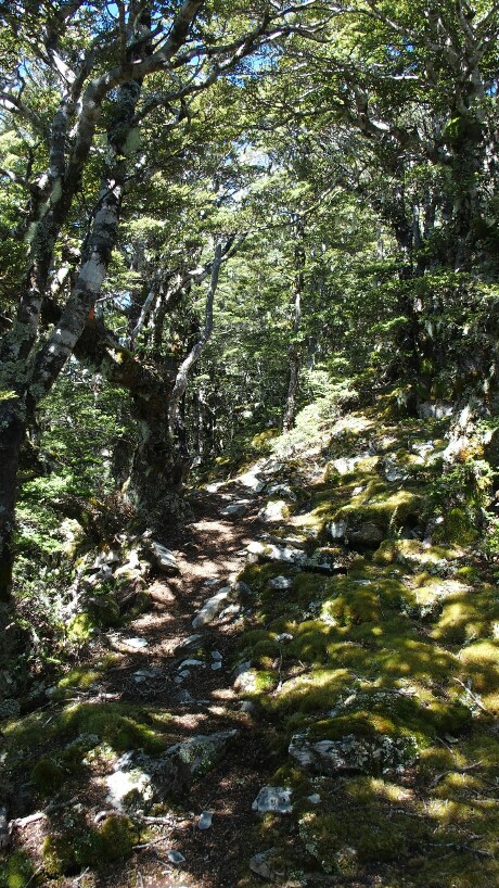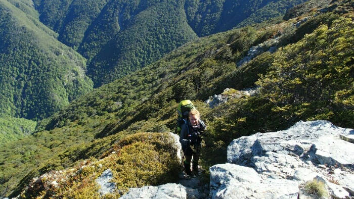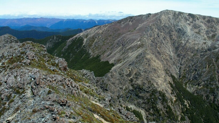 Then it’s some more easy time through the forest until we reach the tree line. As the exposed parts are so windy we take our lunch break here although it’s not even 11am. Then time to hike uphill to Little Mount Rintoul. Sweating a lot uphill we arrive at the top for some great views – and to see some of the scary bit that is still waiting for us.