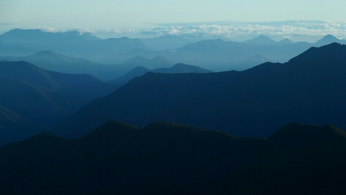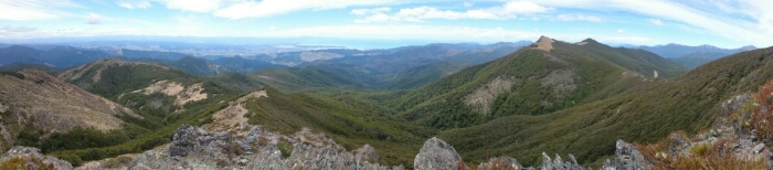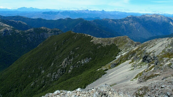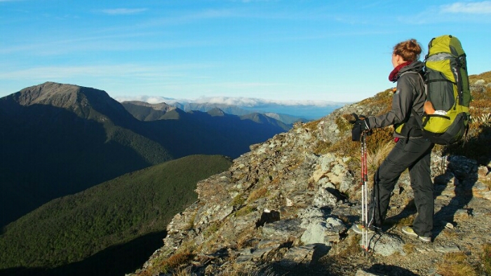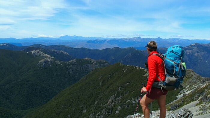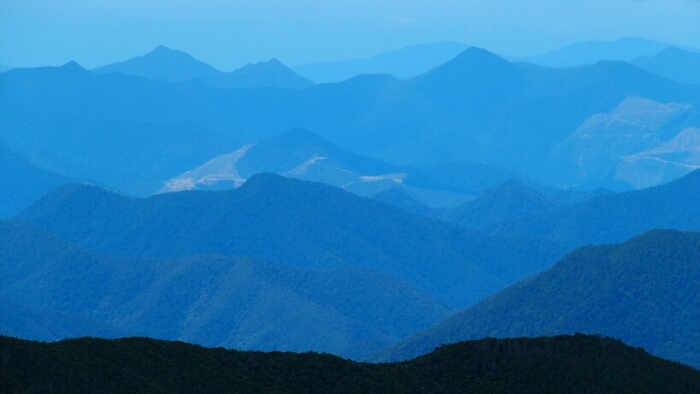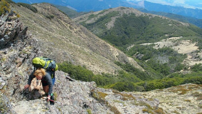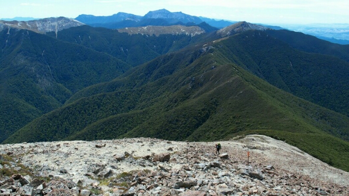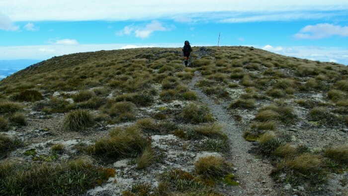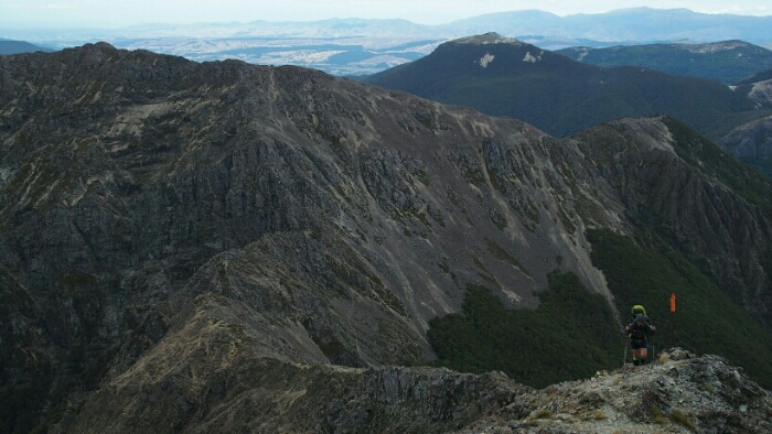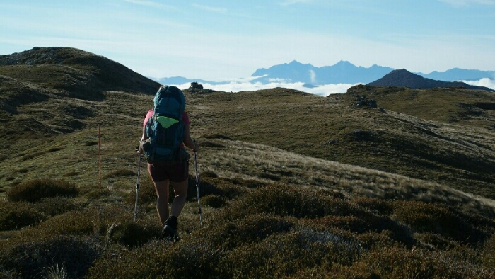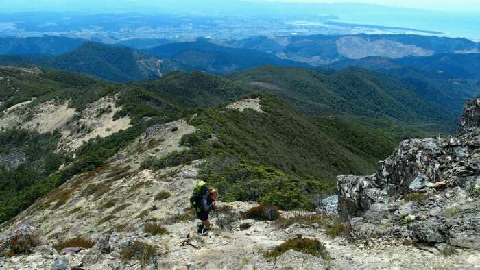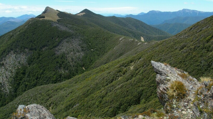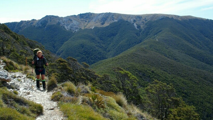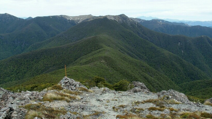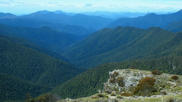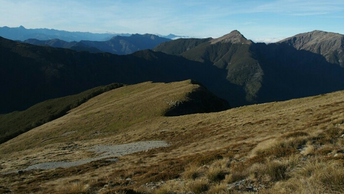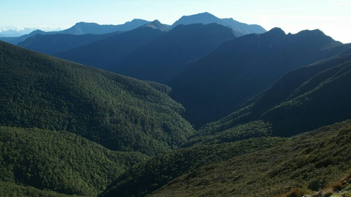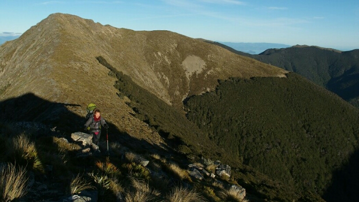 The night was chilly, for the first time I had frost on my tent in the morning. I was still OK though, not too cold (just the one time I went for the loo and to see the beautiful sky full of stars). We decided to leave early at 6.30am as we have a long day ahead. My hands are frozen once I packed up everything but the sun is already shining and making me feel warm again quickly. It’s such a beautiful morning and the hike easy, along the ridgeline. We can see along the ridgeline all the way up to Mount Rintoul, our toughest summit today at over 1700m. But first, time to enjoy the hike, the views, the nice forest,…