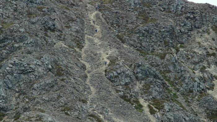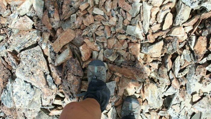 The fight begins shortly after. Scree, rocks, scrambling, climbing, sliding down before repeating the same on the other side but uphill. I like the climbing bits but the scree is unnerving and taking a lot of strength. For Peggy it’s worse, she’s not yet used to hiking with the heavy backpack whereas my whole body has gotten used to it over the last months and my feet find their way on their own now!