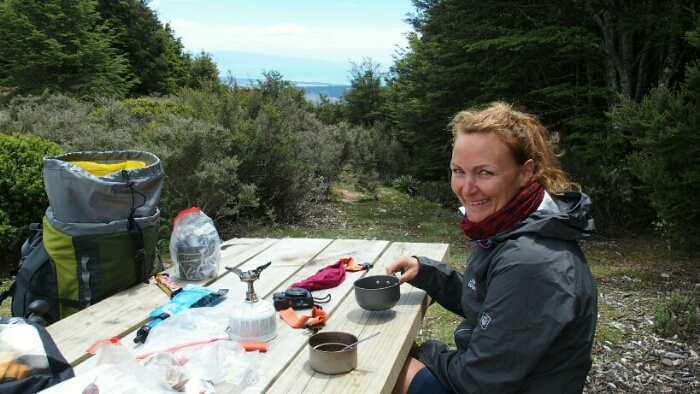 When we finally leave the river it’s not getting better. We have to climb up 900m altitude difference in mainly steep forest. Shortly before the hut we have to stop and have a lunch break to recover. Then it’s 15 more minutes until the Starveal Hut where we arrive around 12.30pm. Now we take a long break, cooking coffee, eating sweets, resting our shoulders but also filtering plenty of water.