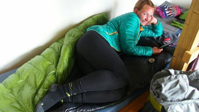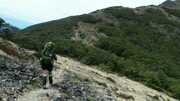 Then downhill, more scrambling, more scree, more swearing until finally it’s into the forest and when I think I actually missed the hut it’s finally there! Only Silvano, an Italian living in New Zealand, is already there but in his tent. Cool, we have plenty of time to pick our preferred beds, spread out our stuff, do stretching before the others arrive. The view is nice from 1250m altitude, once more Golden Bay (feels like we’re not getting away from it). A Kiwi lends me a needle and thread to finally sew my leggings and Silvano who is going back to Nelson offers to take our rubbish. Everyone is as kind as always here in New Zealand. The other big hiker group of 7 is camping except for two of them. Later Pawel, the Polish TA hiker joins us, he only started at 11am!