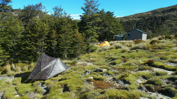 The Slaty Hut is already full, others already have their tents set up as well. Not easy to find a flat spot but we manage and soon enjoy a little more the sunshine, sitting outside, snacking a little to get rid of more pack weight before having dinner and then hiding in our tents when it gets cold at 7pm when the sun disappears behind the mountains. A long day awaits us tomorrow so we better get some rest anyway!
