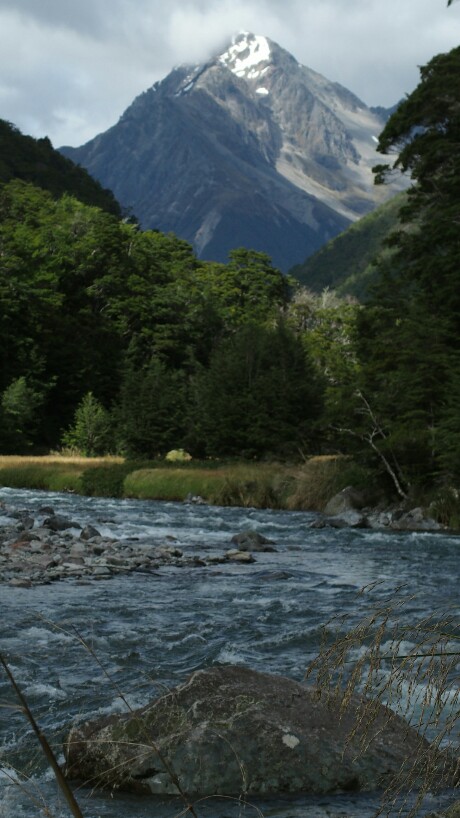 The hike along the lake is rather easy and flat but with the rain it’s also slippery and muddy plus we now have very heavy backpacks again with 8 days of food. There are also a few river crossings that are starting to be difficult to manage with dry feet as the water level is raising with the rain. We don’t talk much just endure getting soaking wet in our rain gear and kind of hope to be soon at the first hut. It’s 10km and takes us a bit more than 3h. The three hikers we already met yesterday in Saint Arnauds are still there but preparing to leave the hut. It’s a very big hut compared to the 6 bunks ones of the last stretch. We start drying our stuff while having lunch, hoping for the weather to become better so we can more easily continue to the next hut. As we want to prepare coffee, I cannot get the stove to work. I assume the canister I got from Christian yesterday is not working somehow (a full one in exchange of our used one as a gift). So, either eight days to Boyle without warm food or walk back to St Arnauds. Rather unhappy I put my wet gear back on, pack the canister, stove and money in my small pack and head out again to town. Peggy is staying here and looks after our stuff. I almost run, making the 10km in just 1h50. The sun has come out by the time I reach Saint Arnauds and now I get a beautiful view at least!