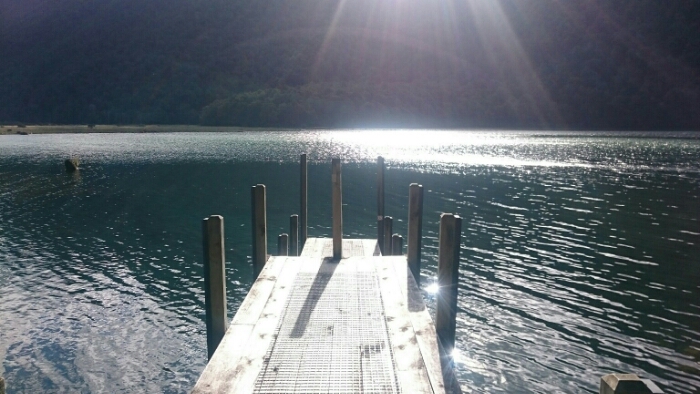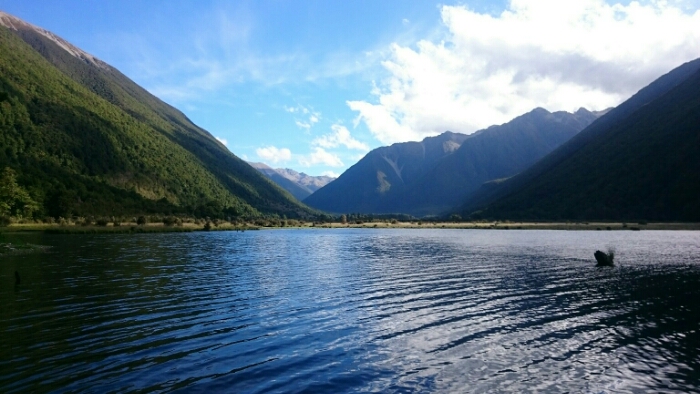 The hike along the lake is rather easy and flat but with the rain it’s also slippery and muddy plus we now have very heavy backpacks again with 8 days of food. There are also a few river crossings that are starting to be difficult to manage with dry feet as the water level is raising with the rain. We don’t talk much just endure getting soaking wet in our rain gear and kind of hope to be soon at the first hut. It’s 10km and takes us a bit more than 3h. The three hikers we already met yesterday in Saint Arnauds are still there but preparing to leave the hut. It’s a very big hut compared to the 6 bunks ones of the last stretch. We start drying our stuff while having lunch, hoping for the weather to become better so we can more easily continue to the next hut. As we want to prepare coffee, I cannot get the stove to work. I assume the canister I got from Christian yesterday is not working somehow (a full one in exchange of our used one as a gift). So, either eight days to Boyle without warm food or walk back to St Arnauds. Rather unhappy I put my wet gear back on, pack the canister, stove and money in my small pack and head out again to town. Peggy is staying here and looks after our stuff. I almost run, making the 10km in just 1h50. The sun has come out by the time I reach Saint Arnauds and now I get a beautiful view at least!