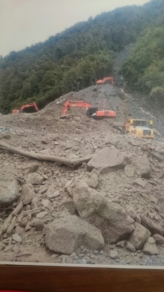 I wasn’t physically exhausted as we walked slowly but the constant worry about the river level, the concentration while crossing, the complete focus on trying to get out of this nightmare was taking its toll. Difficult to endure that the trail markers send you right in the gorse. Finally we can see the footbridge. But also that something seems wrong on the other side. It’s a huge landslide which separated Arthur’s Pass from Greymouth.