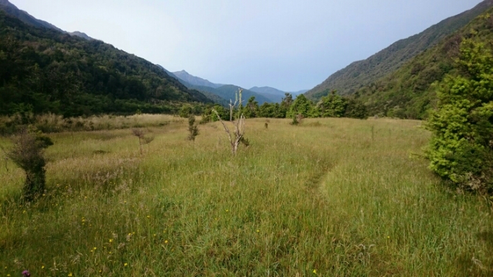 The next 1km takes us almost 2h. We need to do the two final river crossings. Both rivers are spread out in arms and for each we need to find the best point to cross. The Otehake river is the killing point. We try at the best looking point but when the water is more than 1,20m (hiking poles height) and the current too strong we decide to walk back. We end up crossing much further upstream, having then to bushbash back to the empty river bed and trail. There is no marker so we just try to get ahead as best as we can, eventually back on a nice 4WD track before it ends again in the river, the trail has just been washed out.