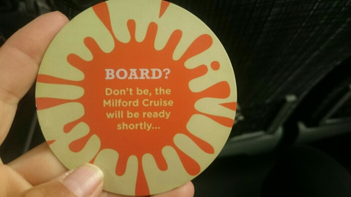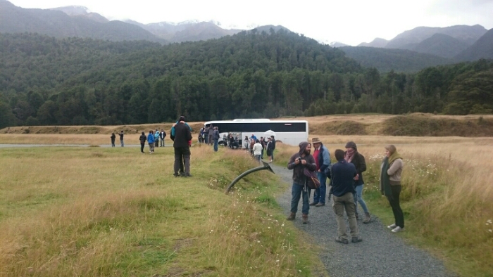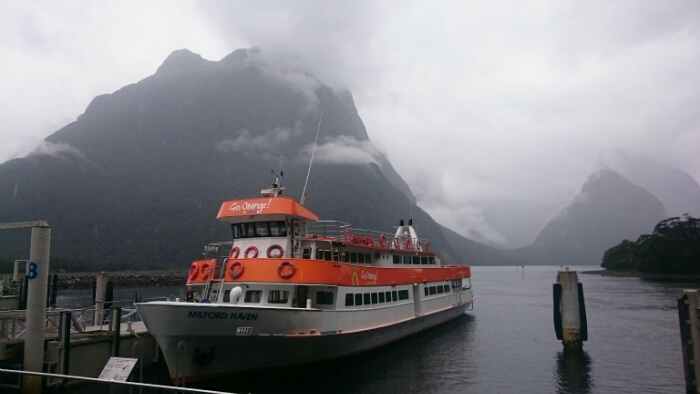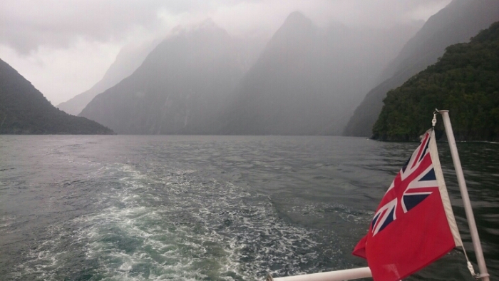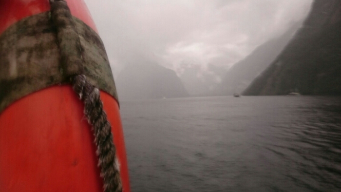 Today we will be driven around, in a bus and by boat. We wanted to see Milford Sound and Te Anau is the closest place to get there. We booked a tour already in Wanaka with Go Orange and a YHA discount ( 101$). I really look forward to this trip, but my morning is difficult, I have a sore throat and feel quite bad, a cold is coming. At 9.30am the bus leaves for the 120km to Milford Sound. Our chatty driver makes the worst jokes but is knowledgeable and I learn a bit about the history and nature. First stop is at Eglinton for a viewpoint of the mountains. With a 84% chance of rain in Fjordland we of course get rain and clouds hiding the view. It doesn’t matter though, Milford Sound is supposed to be impressive no matter what kind of weather.