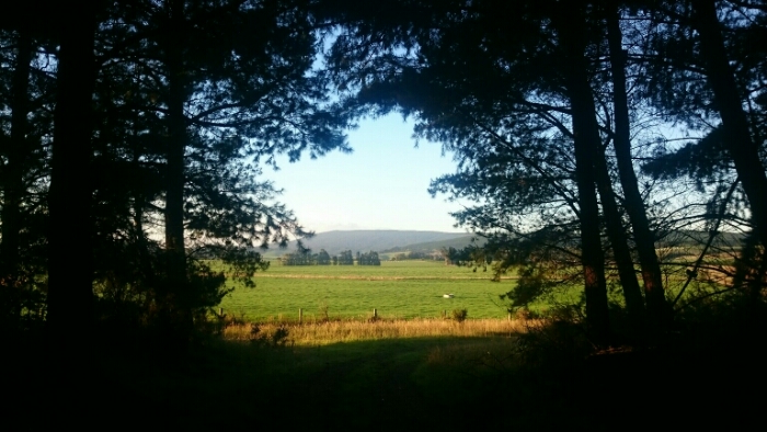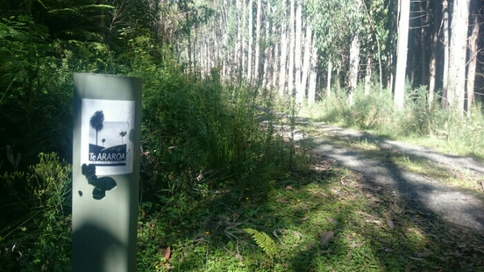 After some farmland it’s a 3.5km road connection to the next bit of trail through Island Bush. Easy walking through some forest for 4km. And soon we are out again on the road to Merrivale, a tiny town with just a few houses. Merrivale road takes us about 8km further, first amidst farmland with sheep, dear and cows. At a house we stop and ask for some water to fill up our bottles. It’s only early morning and I am already sweating and warm. Then we continue through eucalyptus trees, smelling really good.